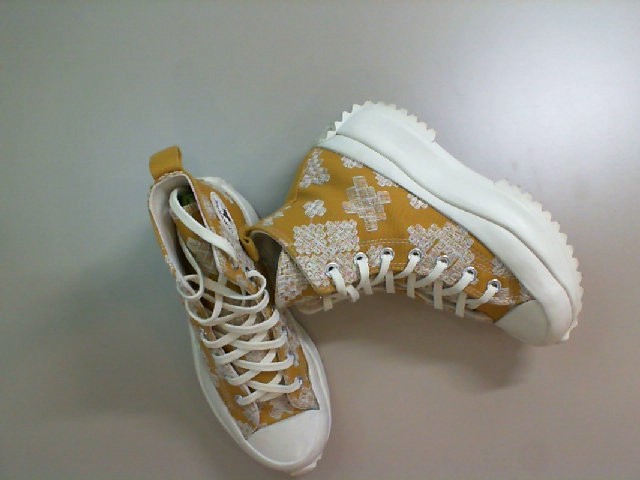 These women's high-platform lace-up sneakers feature a vibrant yellow hue complemented by a charming white lace-inspired pattern, which provides a touch of elegance and playful fashion to any casual outfit. The high-platform design not only offers a current trendsetting appearance but also adds extra height, enhancing the wearer's silhouette. The thick white soles offer contrast against the yellow, amplifying the sneakers' visual impact, while also promising durability and comfort for all-day wear. The high-top style ensures additional ankle support, which, when combined with the robust lacing system, guarantees a secure and customizable fit. These sneakers are perfect for a fashion-forward individual seeking a blend of comfort, style, and a pop of color.