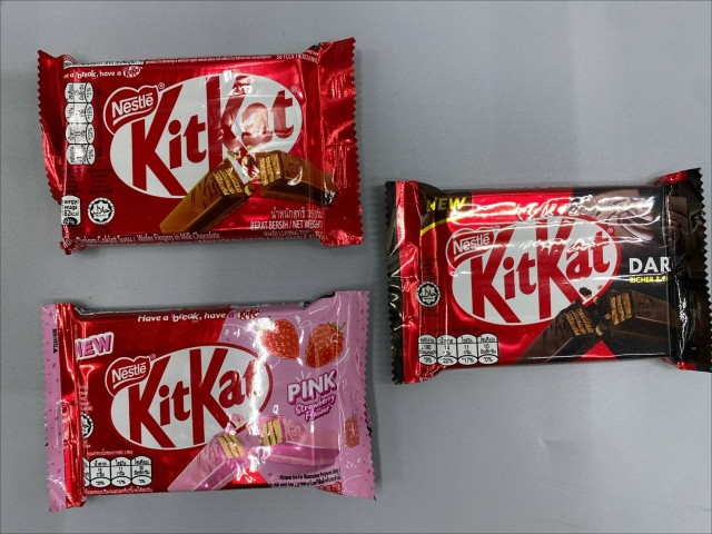 Set of 3 Kit Kat chocolate bars from Nestlé come in classic milk chocolate, pink strawberry, and dark chocolate flavors.
