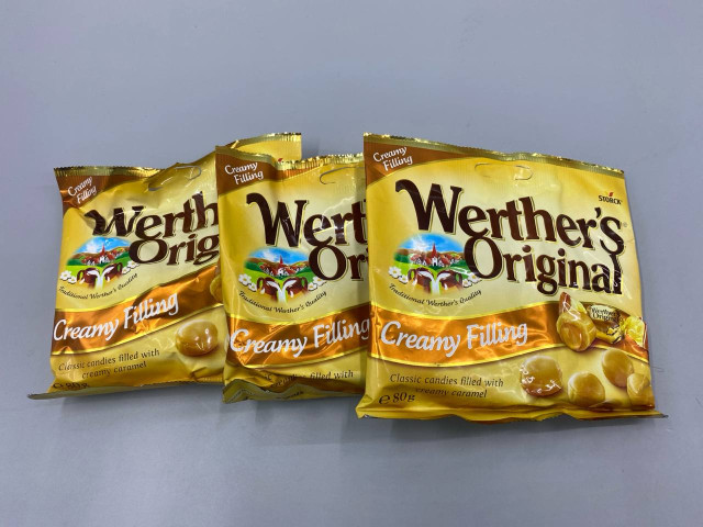 This product features a set of three individually wrapped packs of Werther's Original cream candies...
