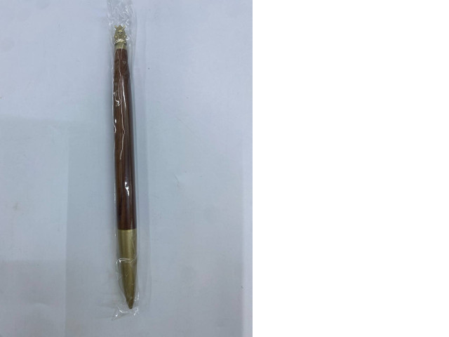 This is a classic ballpoint pen featuring a sleek and elegant design. The body of the pen is made of polished wood, giving it a warm and natural appearance. Its wooden finish contrasts beautifully with a shiny gold-colored bottom section, adding a touch of sophistication. The pen is encased in a clear plastic packaging, which ensures its protection and presents it attractively. The writing tip is smooth, allowing for easy and fluid writing experiences. Its ergonomic design makes it comfortable to hold, making it suitable for both everyday use and as a stylish accessory.