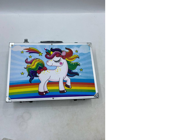unicorn-themed art set for kids in a portable aluminum case.