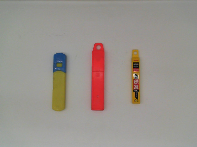 This set includes three utility knife boxes, each featuring a different color—blue, red, and yellow—providing easy identification and organization. The vibrant colors add a visual appeal while also facilitating quick access to the right tool when needed. Each cutter is enclosed in a protective case that ensures safety when not in use and enhances portability. The cutters appear to have sliding mechanisms for blade extension and retraction, making them versatile for various cutting tasks. The boxes seem to be compact and easy to store, making them suitable for office settings, workshops, or domestic use. The presence of Japanese text suggests that at least one of the cutters may be of Japanese manufacture, often associated with high quality and precision engineering in cutting tools.