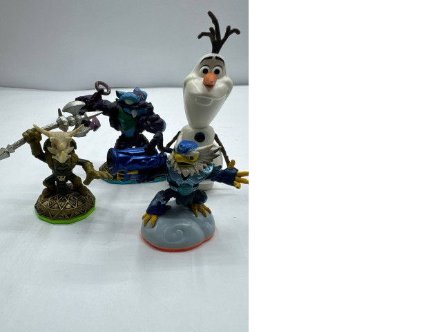 This delightful set of souvenir figurines features an exciting collection of characters. Notable among them is a cheerful snowman with a big smile and a classic carrot nose that adds a playful touch to any display. The intricate details on the figures, such as the unique armor of the character wielding a spear and the vibrant colors of the creature adorned in blue armor, create visual interest. Each figurine stands firmly on its decorative base, perfect for showcasing in a collection or as a unique gift.