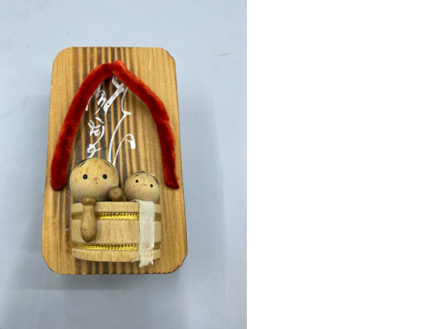 vintage Japanese collectible features two small wooden Kokeshi dolls sitting inside a wooden tub, all mounted on a traditional Geta sandal base.