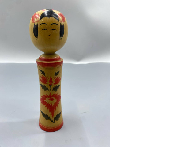 • vintage Japanese Kokeshi doll is a traditional wooden figurine, likely from the Naruko region, featuring hand-painted red floral motifs and a distinct round head.